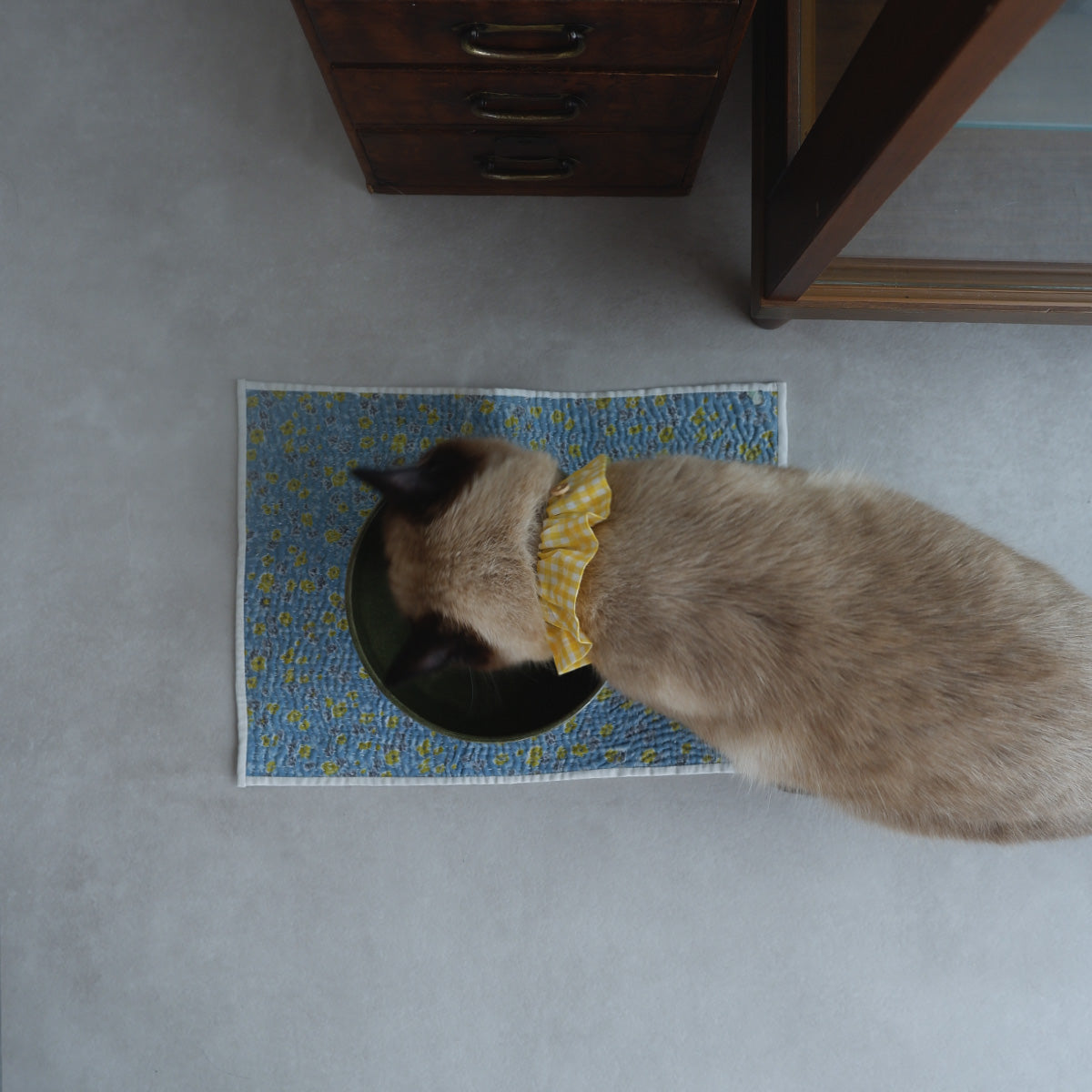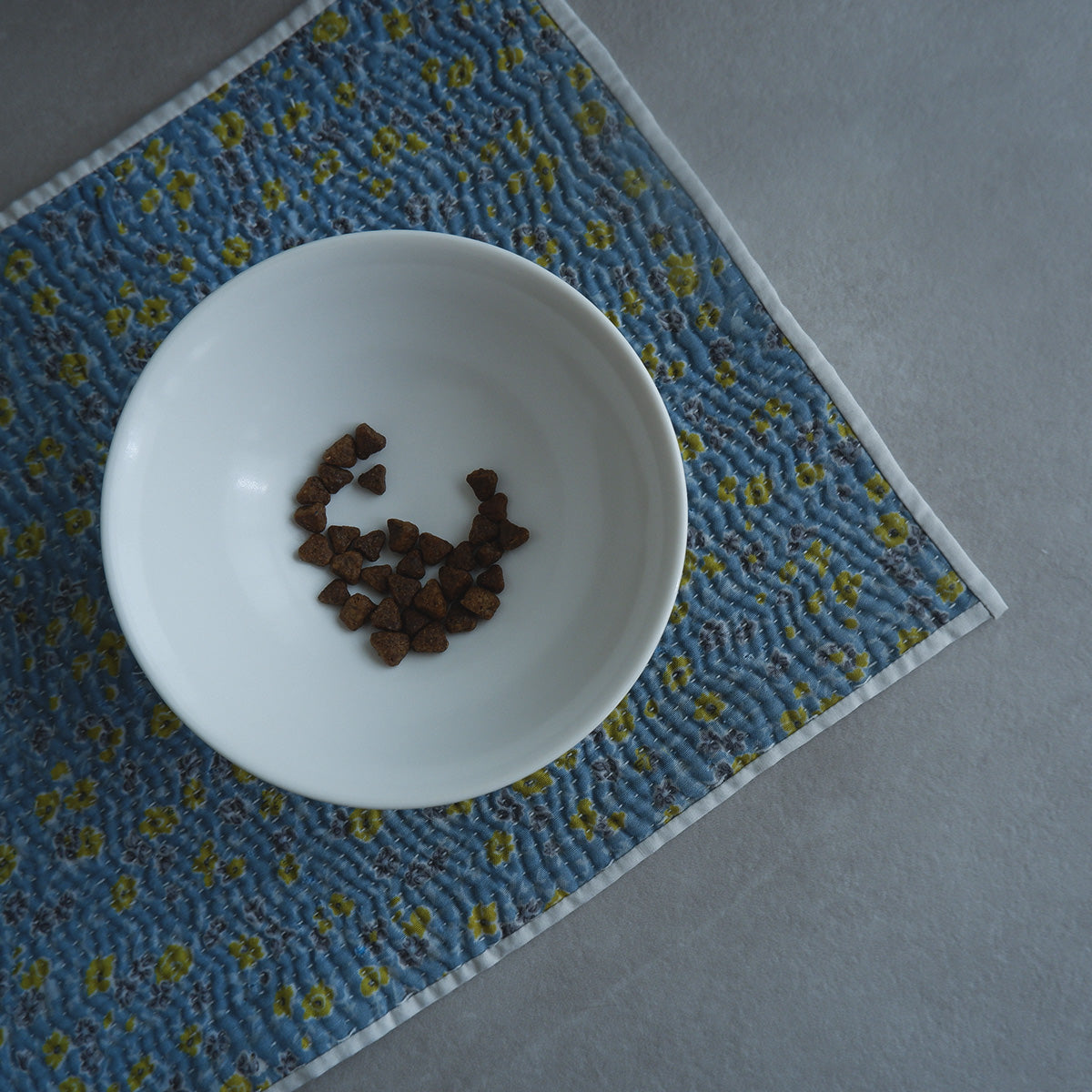 옅은 블루에 옐로우의 작은 작은 꽃이 펼쳐지는, 매력 넘치는 패턴을 사용한 리버시블 사양의 캔터 퀼트 매트.
