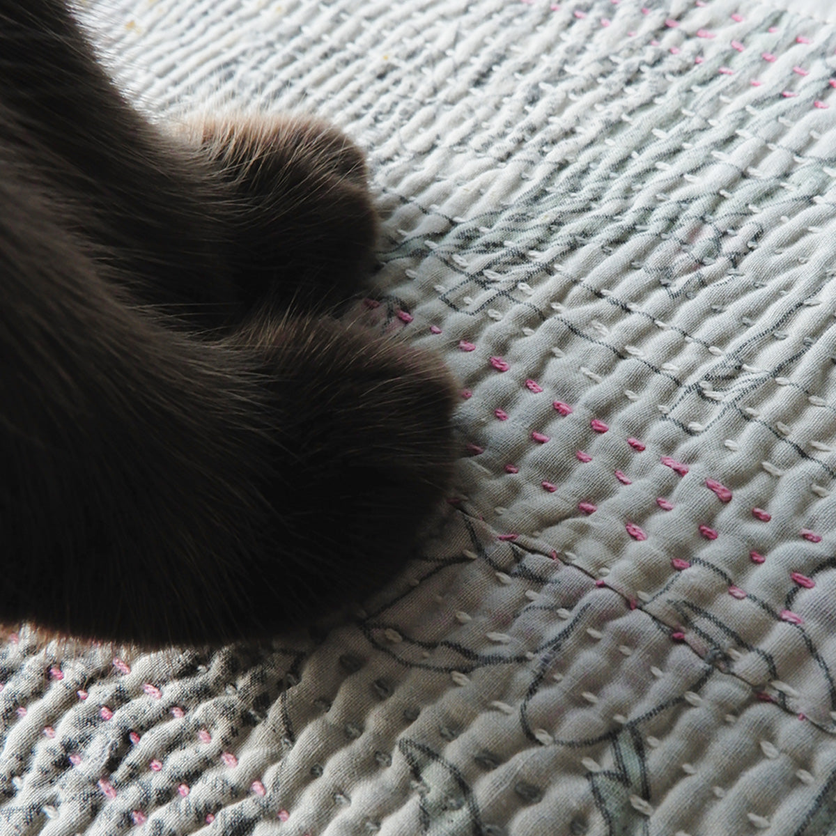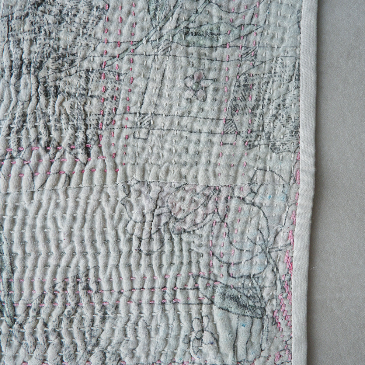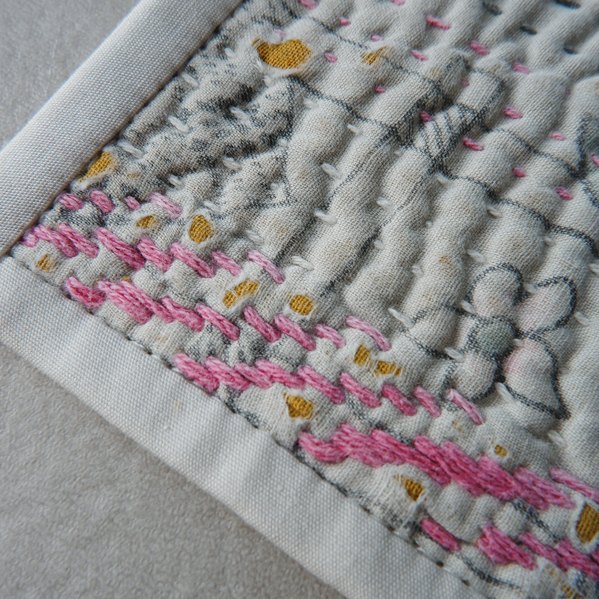 옛 천을 몇 장이나 거듭, 한 바늘 한 바늘 손 자수로 연결한 칸타 퀼트는, 다양한 색의 실이나 낡은 천의 표정의 풍부함 뿐만이 아니라, 생활의 천으로서도 튼튼하고 촉감의 좋은 점이 매력입니다.