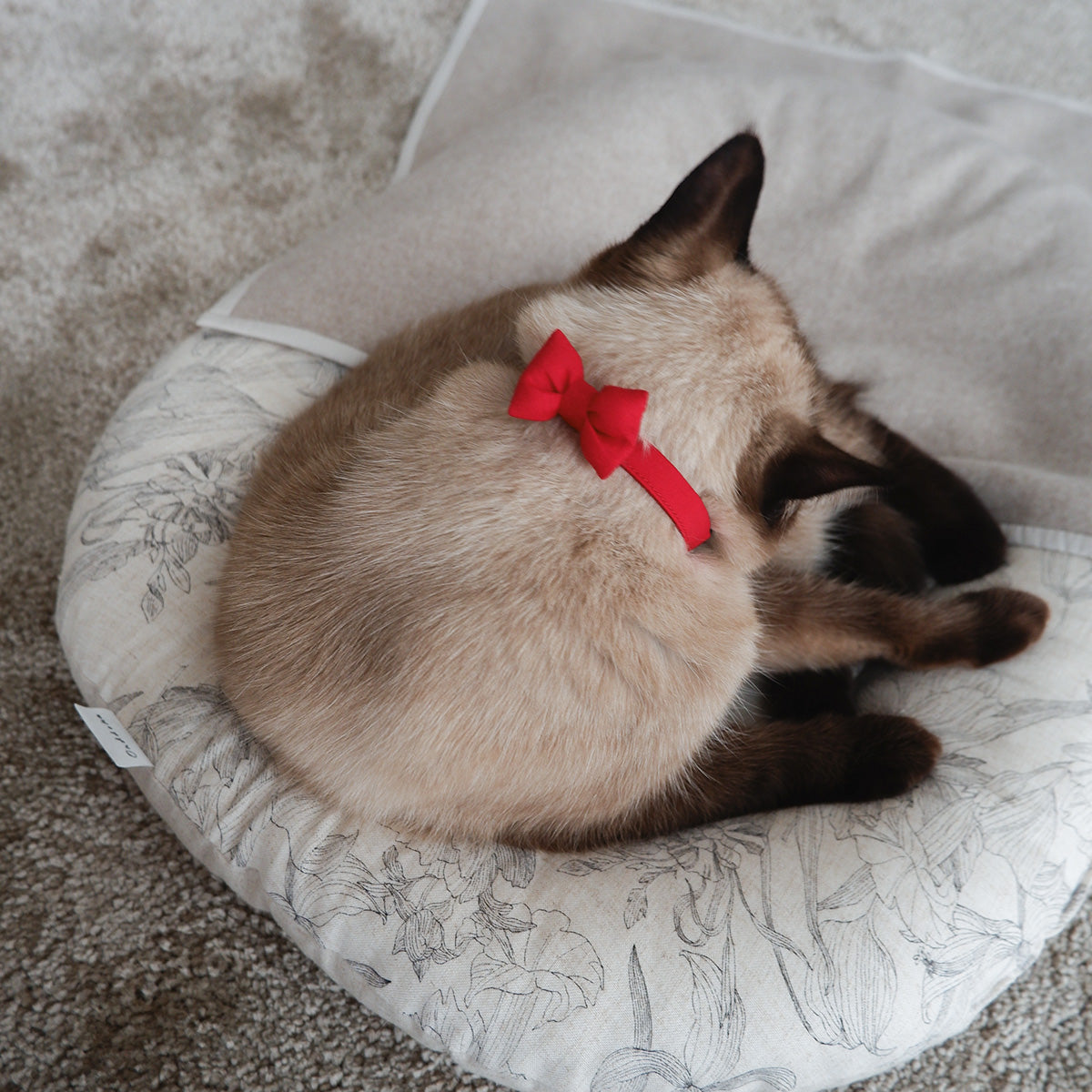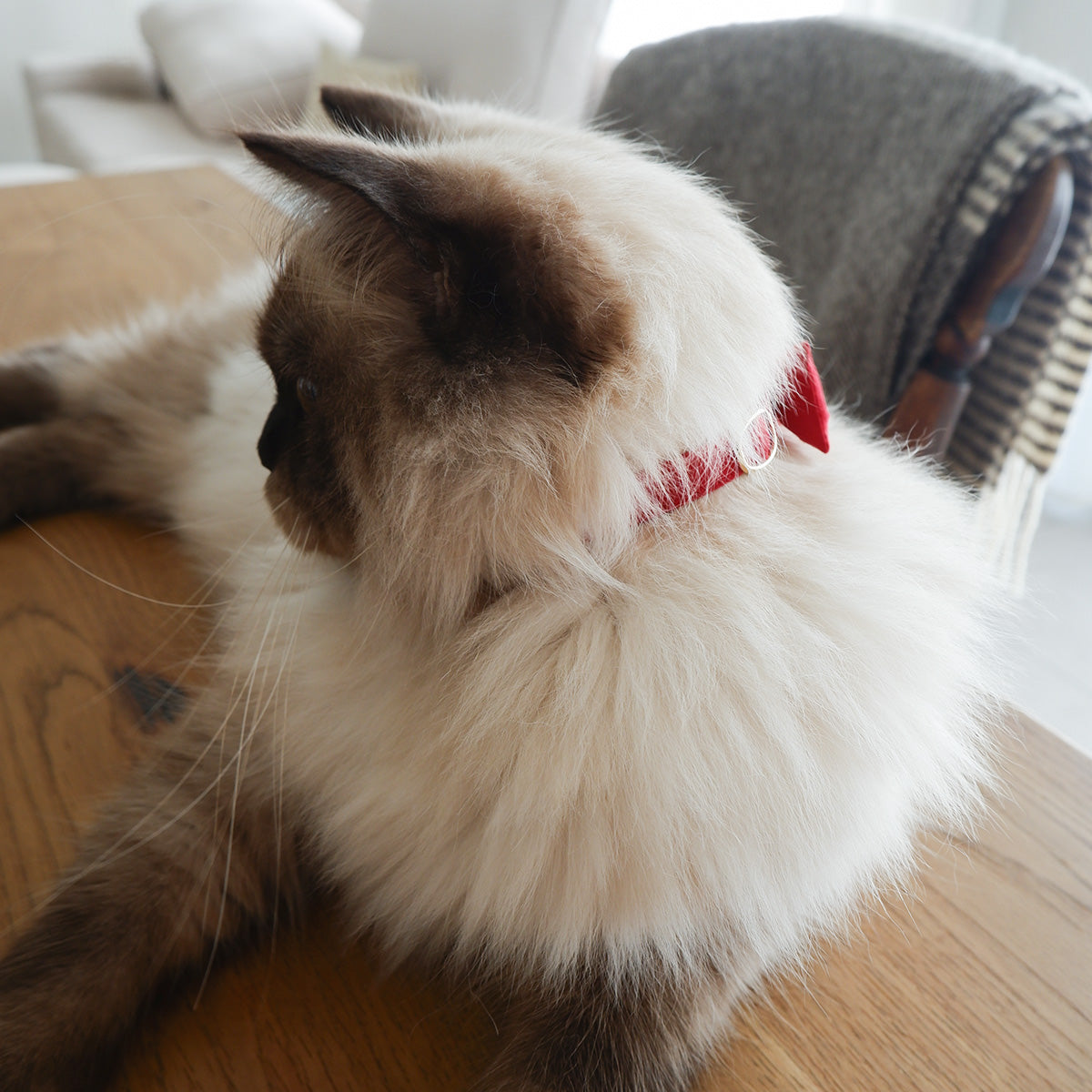 「猫にやさしいコットン首輪」は、通気性や肌触りの良い素材を厳選し、猫にとってストレスにならないことを大切に設計されています。皮膚に当たるベルト部分は、脱毛の原因にならない柔らかい仕様で、リボンなどの装飾も控えめです。