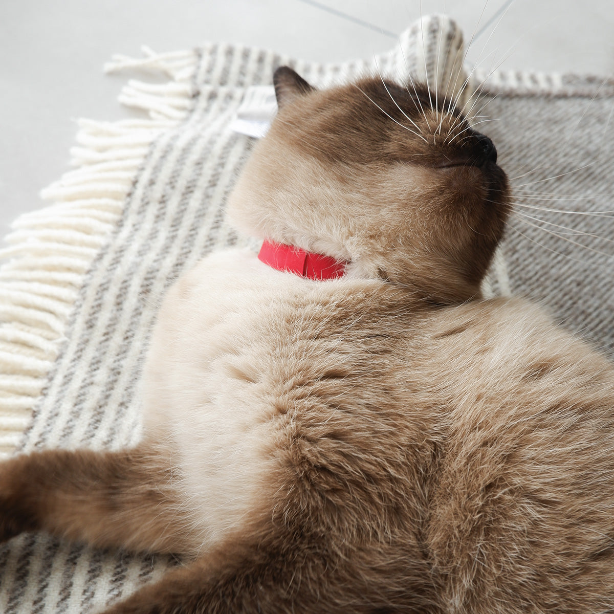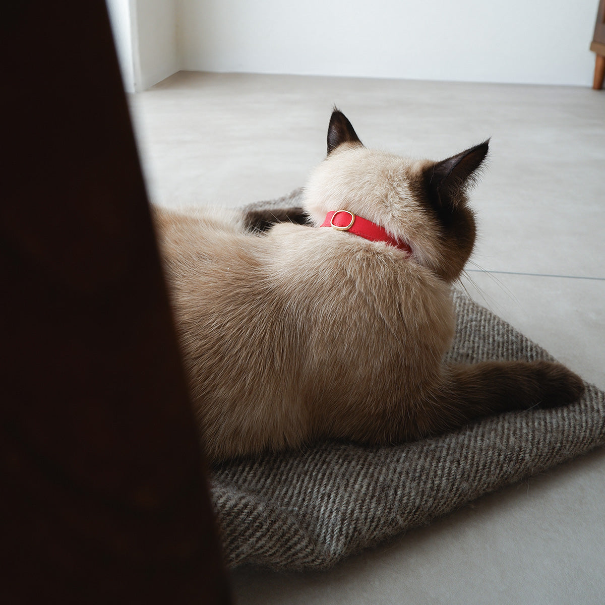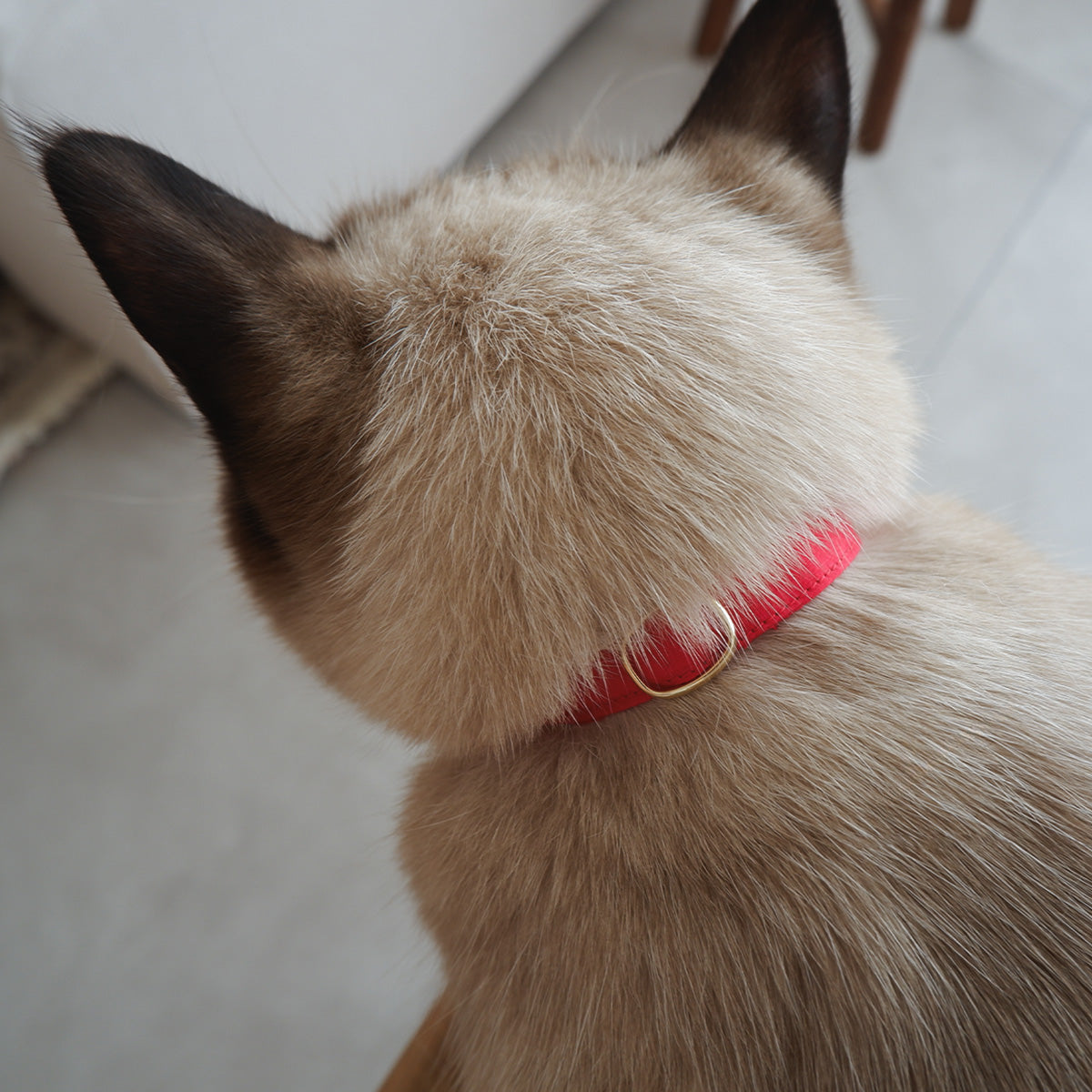 「猫にやさしいコットン首輪」は、通気性や肌触りの良い素材を厳選し、猫にとってストレスにならないことを大切に設計されています。皮膚に当たるベルト部分は、脱毛の原因にならない柔らかい仕様で、リボンなどの装飾も控えめです。