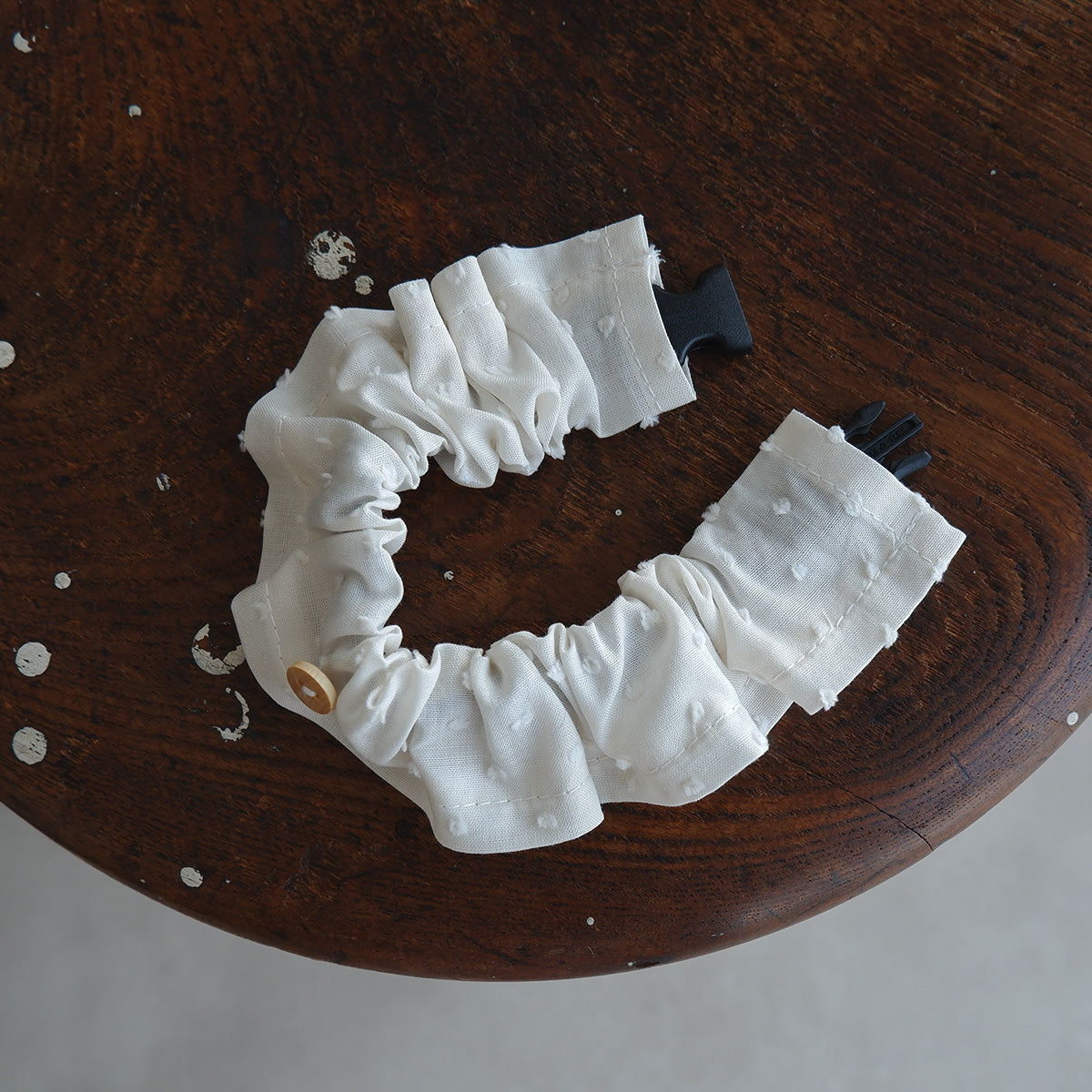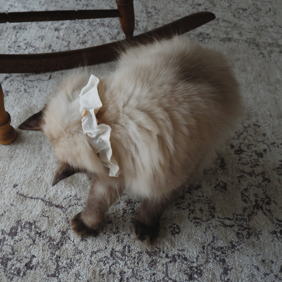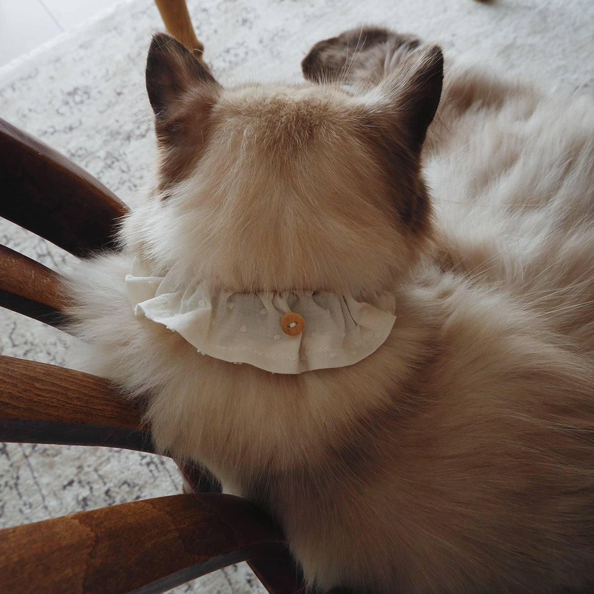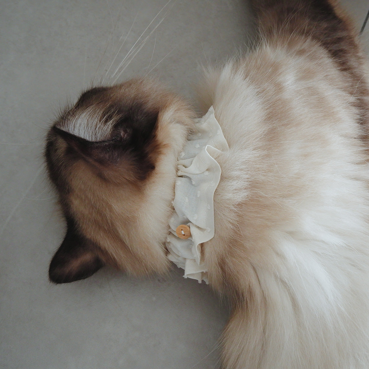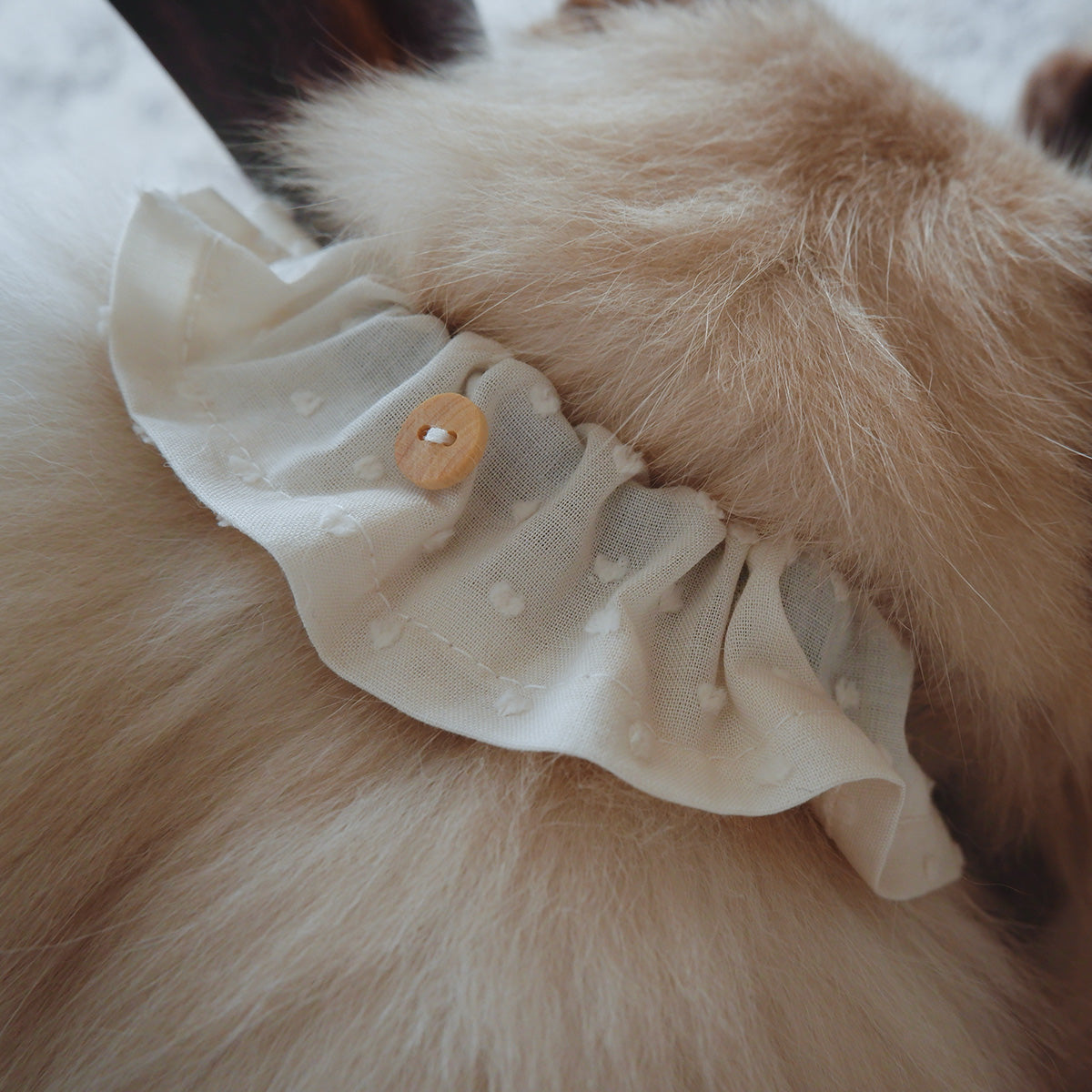 フリルタイプの首輪は、長毛種の猫でも毛が絡まりにくく、首輪が埋もれにくい幅広の首輪です。ネームチャームを引っ掛けられるように、フランスのウッドボタンを付けております。