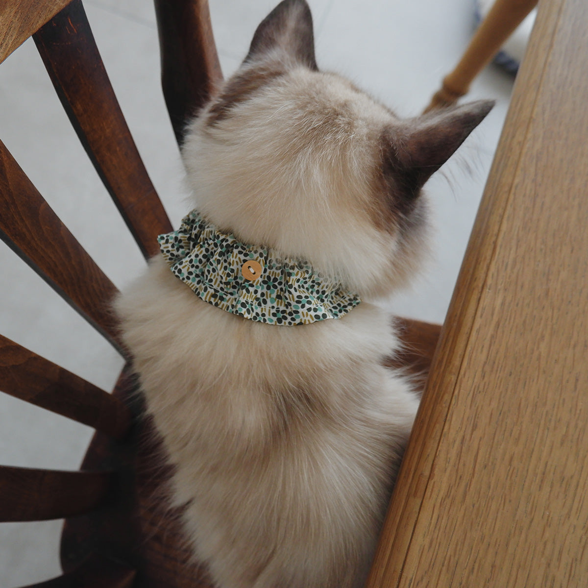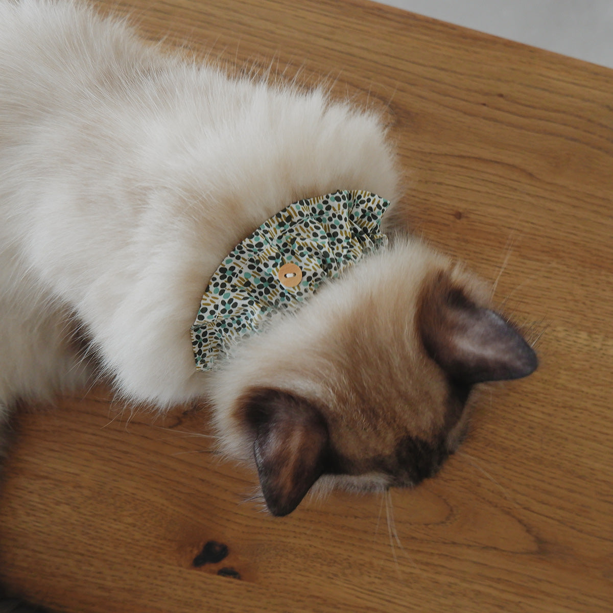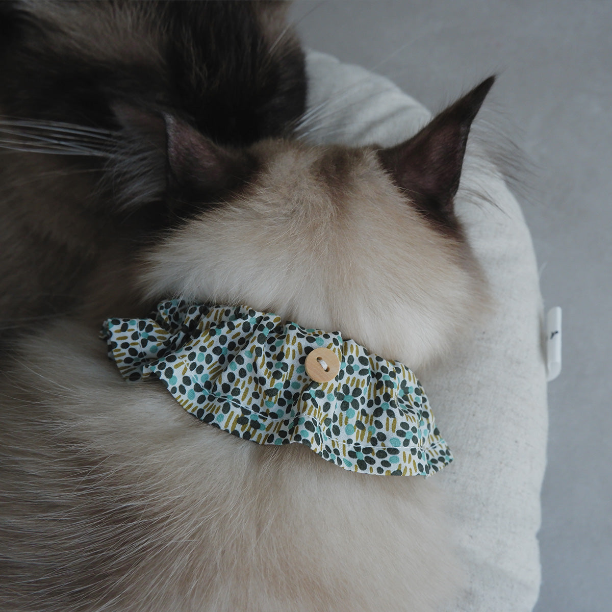 フリルタイプの首輪は、長毛種の猫でも毛が絡まりにくく、首輪が埋もれにくい幅広の首輪です。ネームチャームを引っ掛けられるように、フランスのウッドボタンを付けております。本体生地には、Libertyプリント“Walter's Meadow”を使用しました。