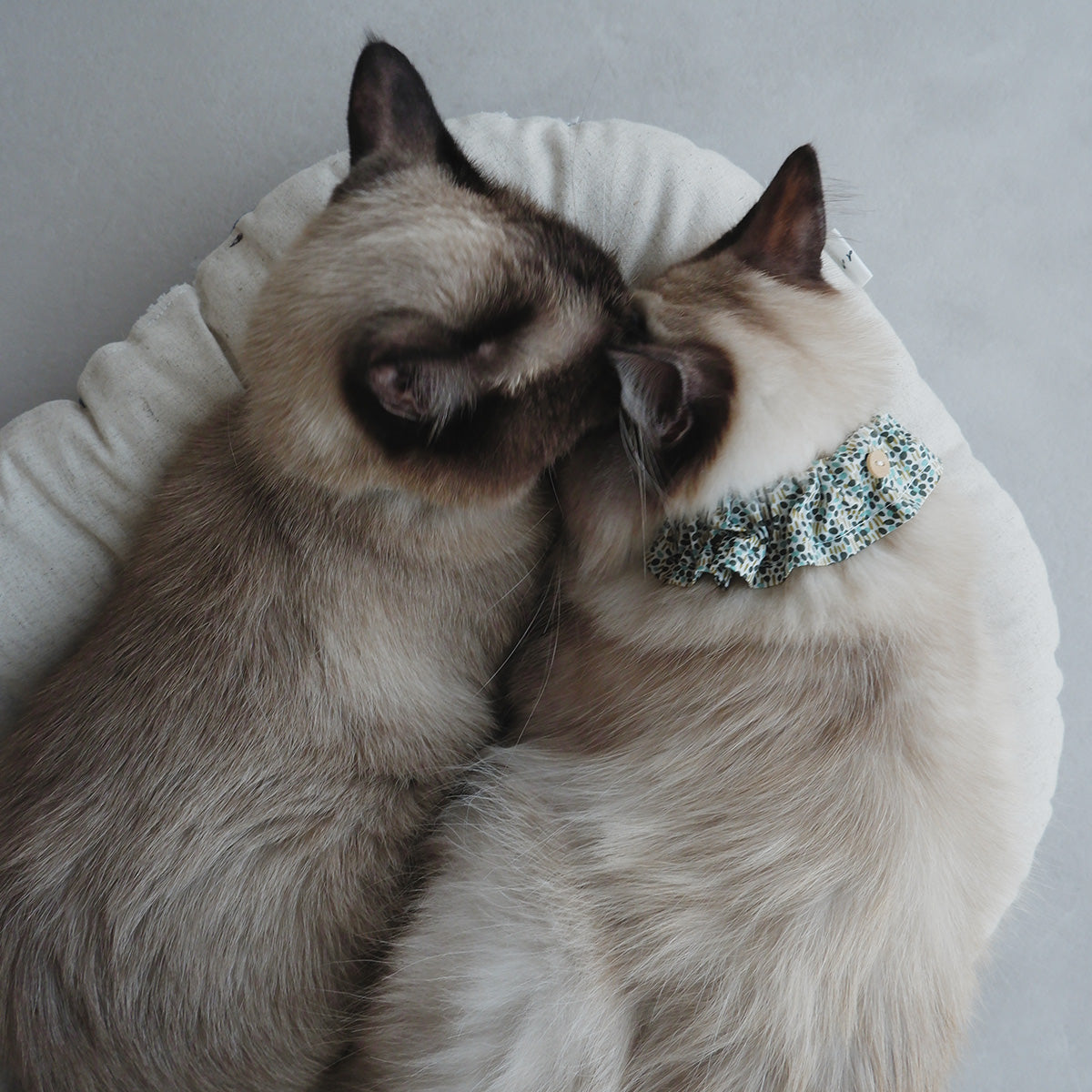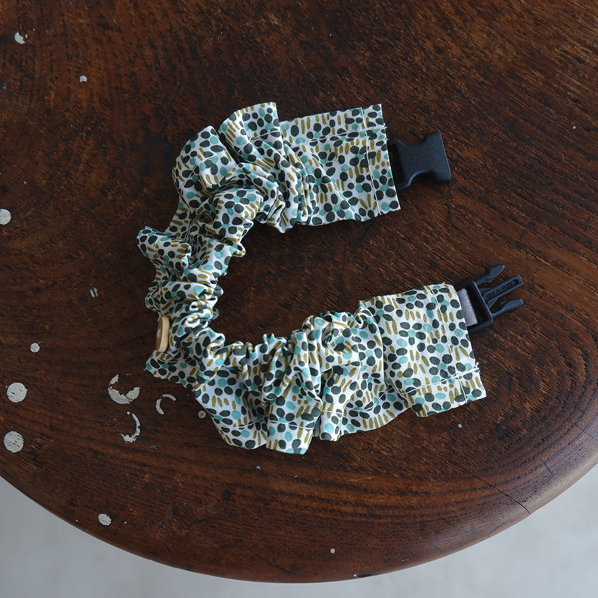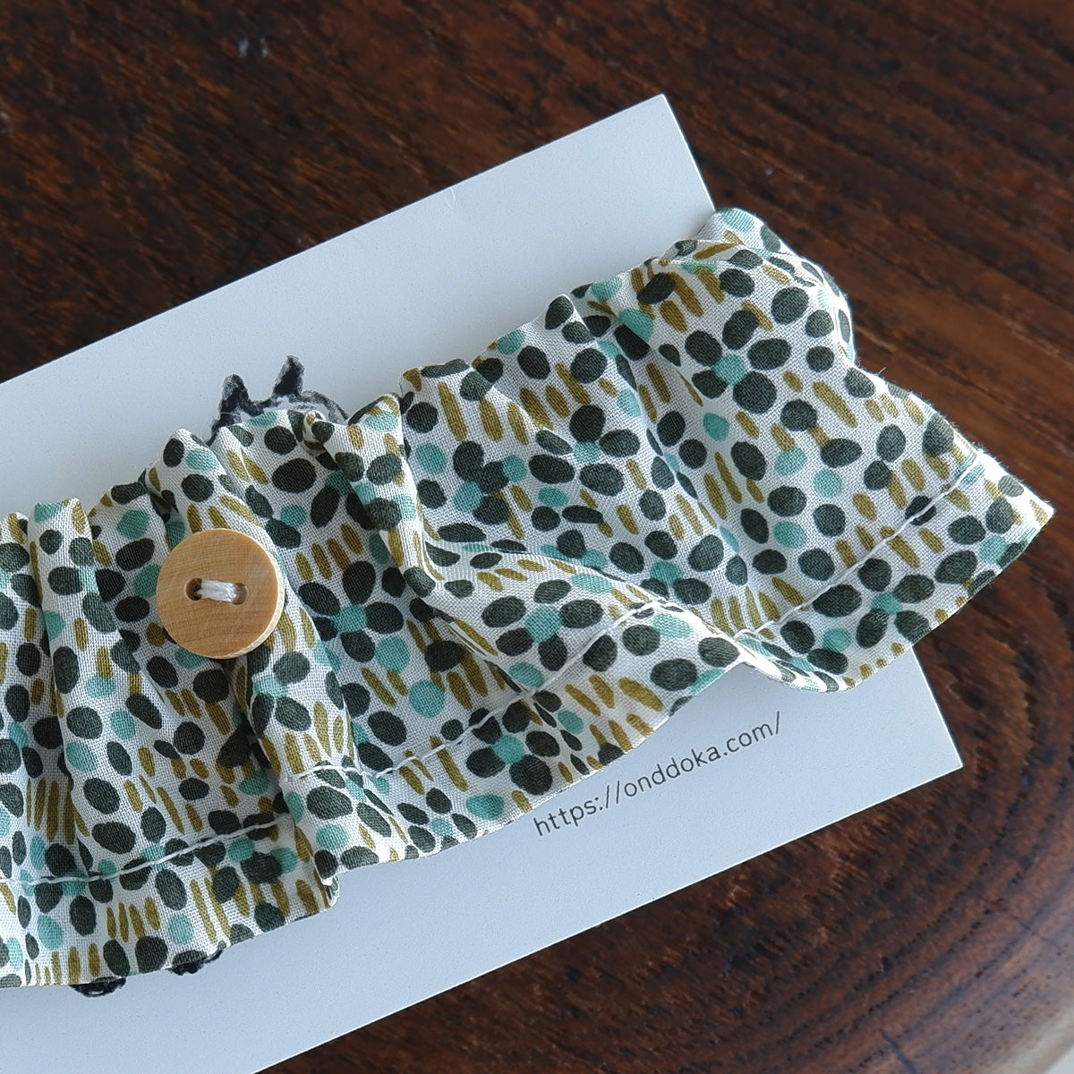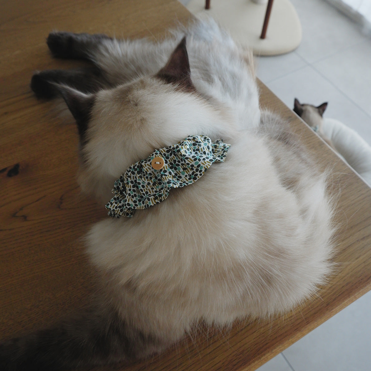 フリルタイプの首輪は、長毛種の猫でも毛が絡まりにくく、首輪が埋もれにくい幅広の首輪です。ネームチャームを引っ掛けられるように、フランスのウッドボタンを付けております。本体生地には、Libertyプリント“Walter's Meadow”を使用しました。