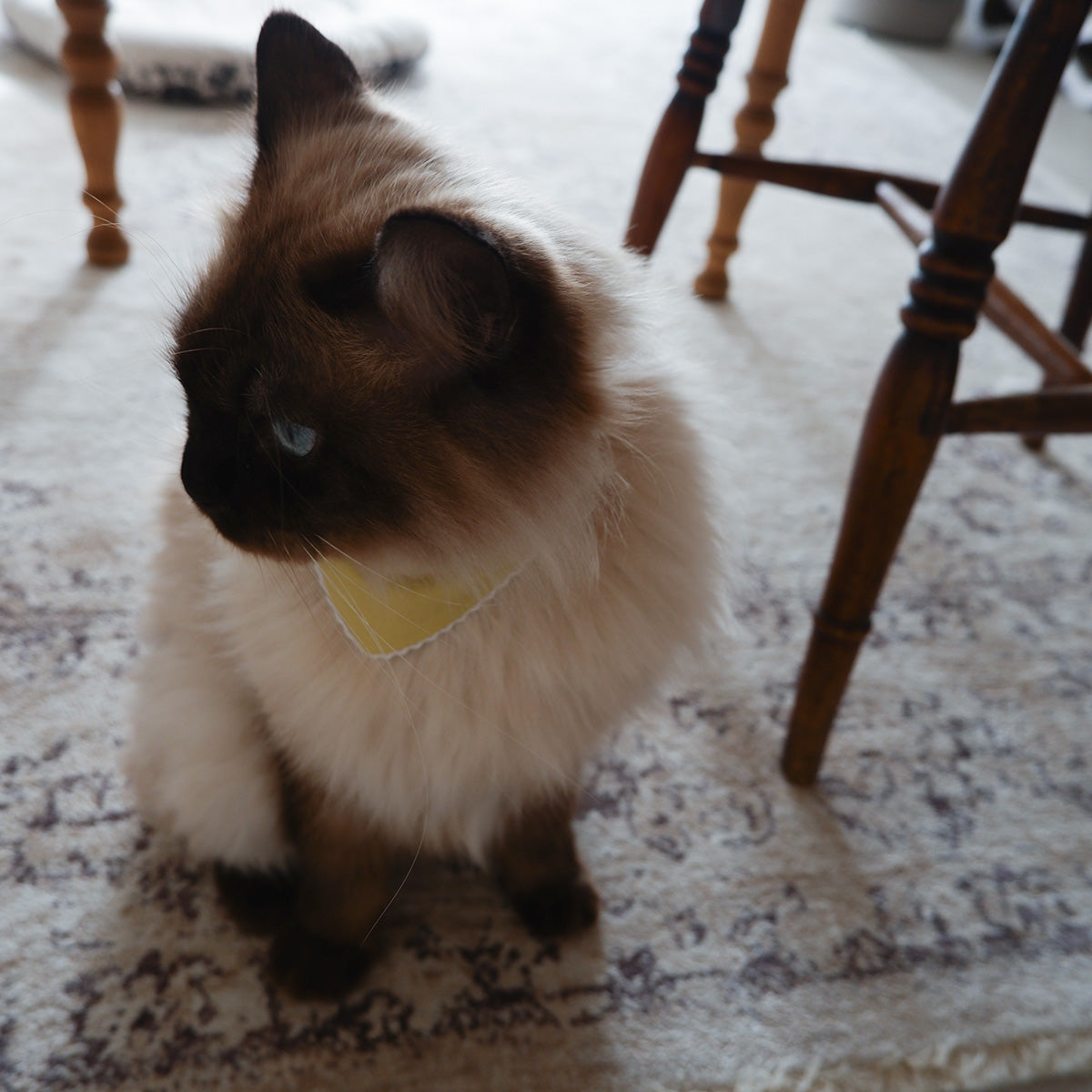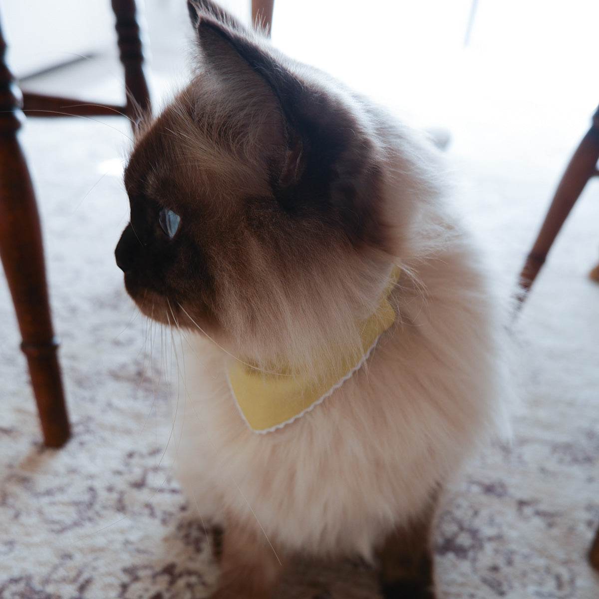長毛種の猫でも首輪が見えやすいように、スタイタイプの首輪を作りました。